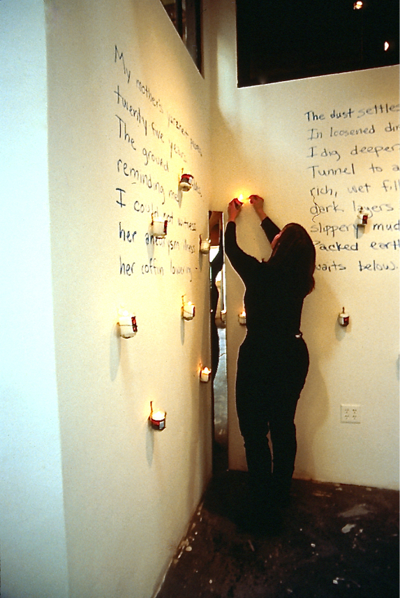 Opie Bellas recites each year between 1974 and 1999 year as I light each of 25 candles. These were the years that had passed since my mother died from a cerebral aneurism. A poem written on the wall references that loss.